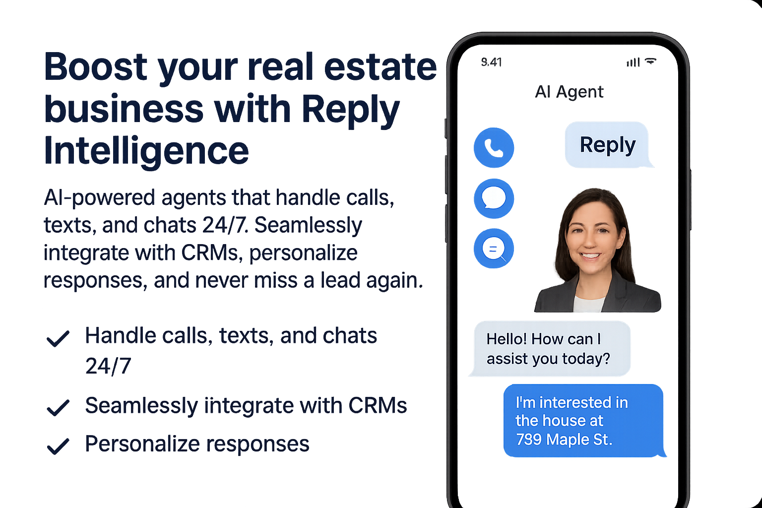 Reply Intelligence is an AI-powered assistant built for real estate agents. It instantly engages leads, manages calls, texts, and chats, forwards messages, books appointments, triggers follow-up workflows, and syncs with your CRM—so you never miss an opportunity.
